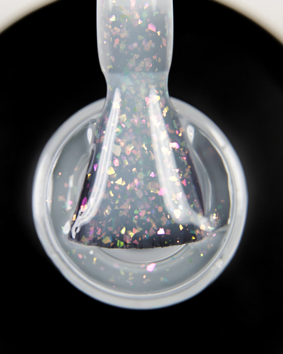 DARK Pro Base Potal 25, 15 ml is a self-leveling base infused with decorative foil flakes—perfect for quick, dimensional salon designs without additional steps.